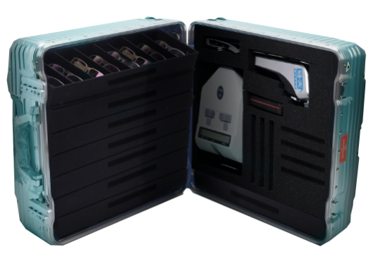 定制验光箱中的手持验光仪能够在几秒内得出眼睛的医疗级数据,现在现已取得 CFDA 的认证。“快速精确的验光与用户的试戴流程完结后,一切的需求数据会回到加工中心。咱们 24 小时内必定会把订单发出去。”彭永泽说。
